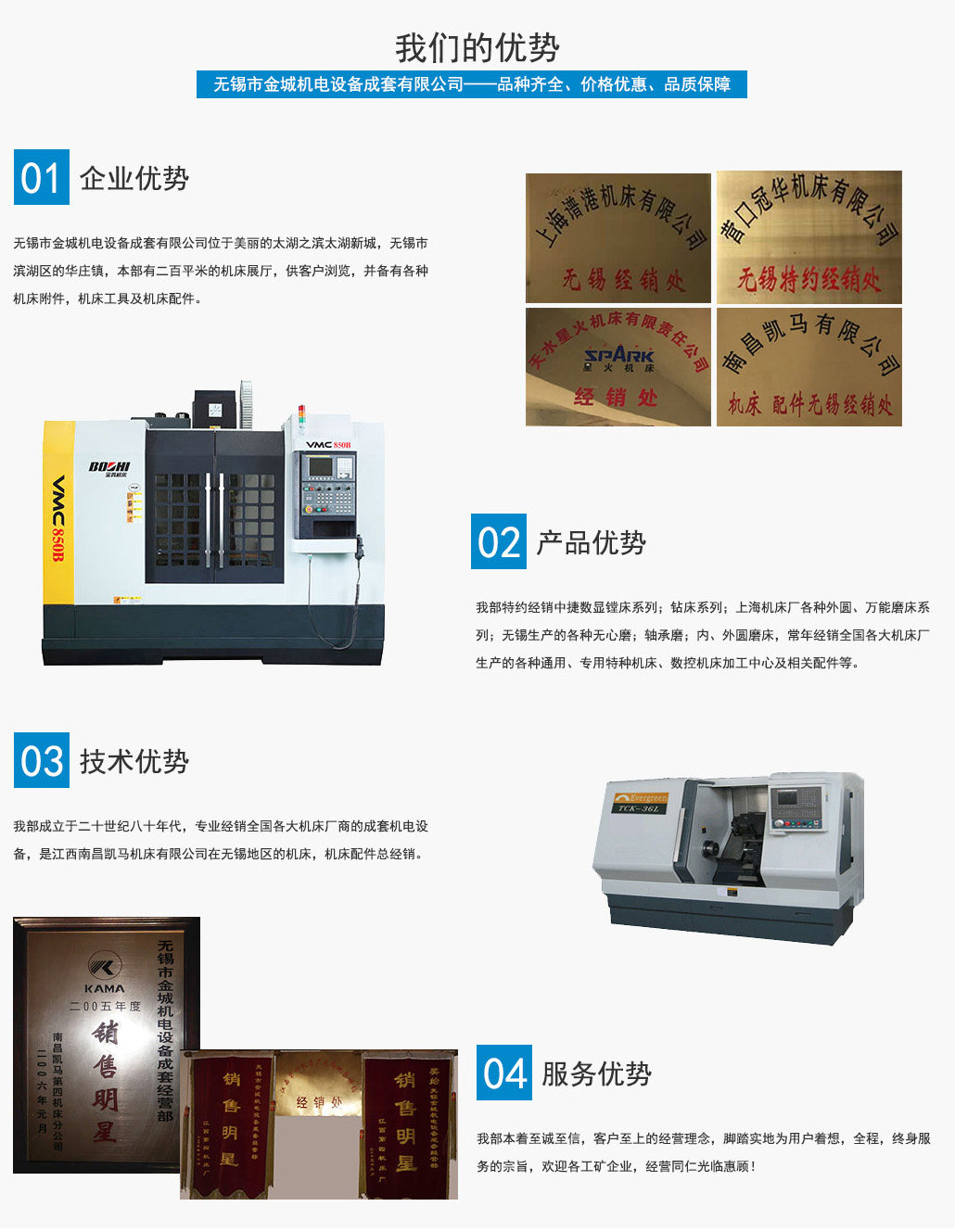 無(wú)錫市金城機(jī)電設(shè)備成套有限公司位于美麗的太湖之濱太湖新城,無(wú)錫市濱湖區(qū)的華莊鎮(zhèn),本部有二百平米的機(jī)床展廳,供客戶(hù)瀏覽,并備有各種機(jī)床附件,機(jī)床工具及機(jī)床配件。 我部成立于二十世紀(jì)八十年代,專(zhuān)業(yè)經(jīng)銷(xiāo)全國(guó)各大機(jī)床廠(chǎng)商的成套機(jī)電設(shè)備,是江西南昌凱馬機(jī)床有限公司在無(wú)錫地區(qū)的機(jī)床,機(jī)床配件總經(jīng)銷(xiāo)。系蘭州里海機(jī)床有限公司,天水星火...